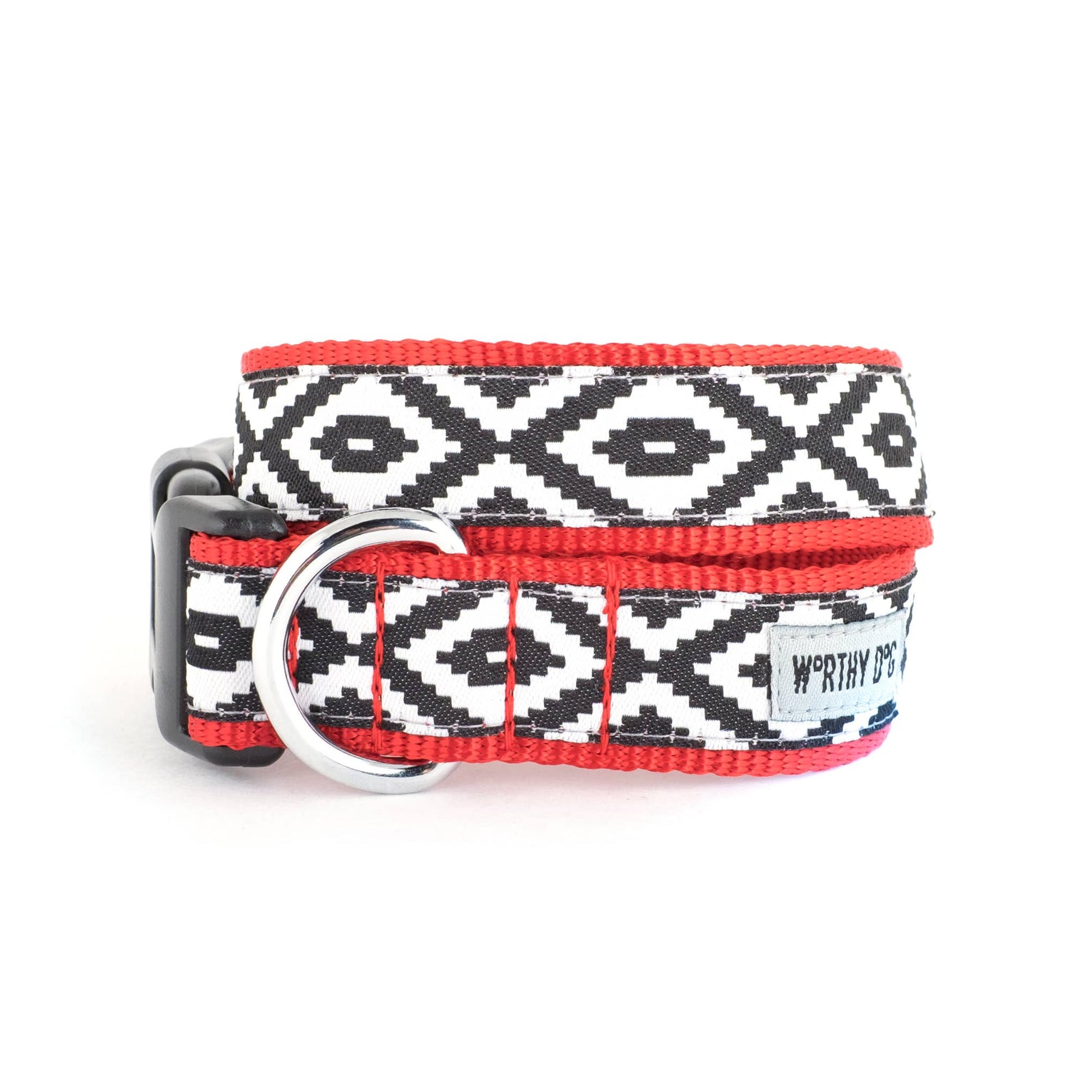 The Worthy Dog's collars are focused on style AND durability! This collar is perfect for everyday wear, featuring woven patterned ribbon sewn onto comfortable and strong nylon webbing with a secure plastic quick release buckle and a nickel-plated D-ring to easily attach tags or a leash. Comfortable to wear and easy to take on and off. Available in multiple sizes with a wide range of adjustability, helping you find the perfect fit for your pup! Don't forget the matching leash!